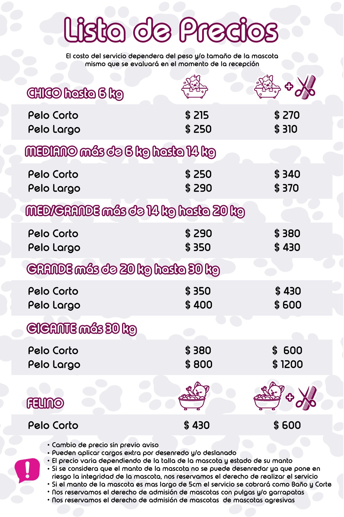 - Pueden aplicar cargos extra dependiendo del estado y tipo de manto en la mascota.